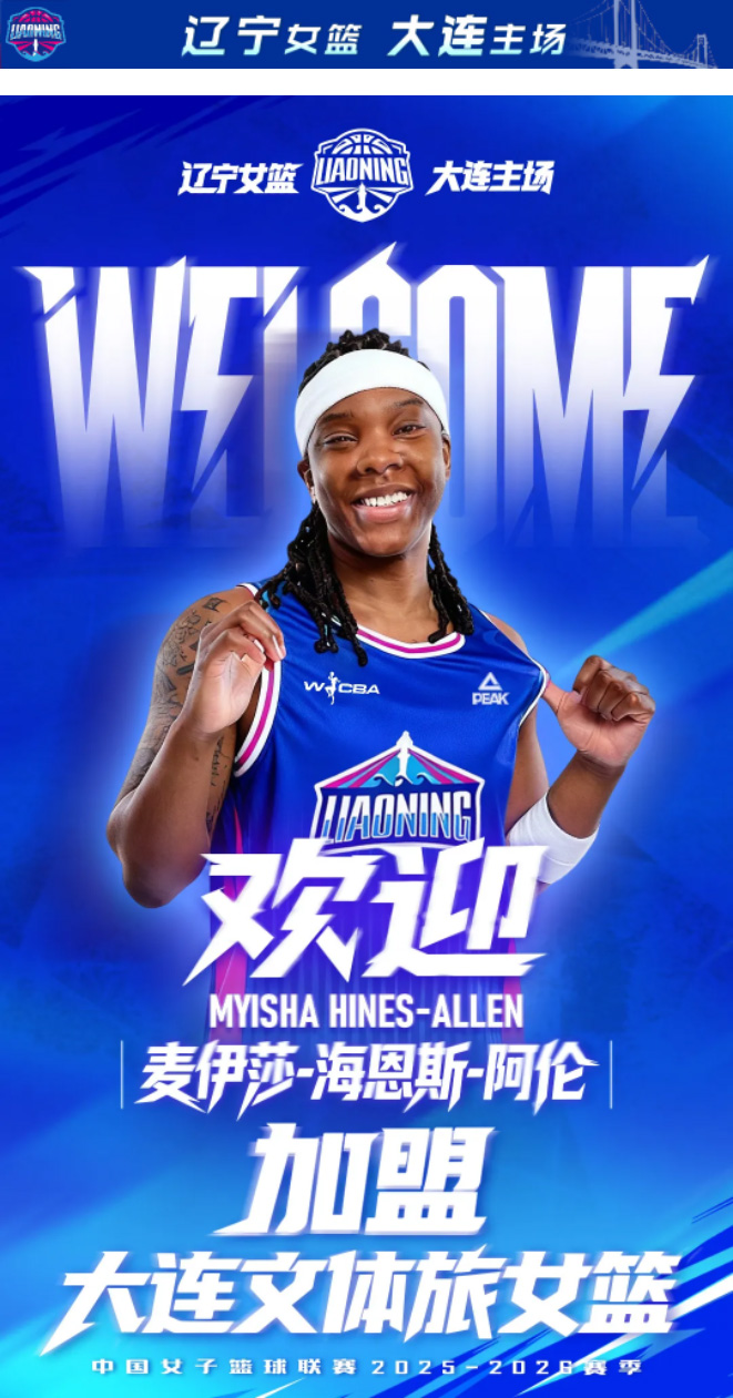 我們相信,麥伊莎 · 海恩斯 · 阿倫的加入,將提升大連文體旅女籃的鋒線與戰(zhàn)力,豐富球隊(duì)的技戰(zhàn)術(shù)打法,期待她在新賽季中助力球隊(duì)取得佳績!